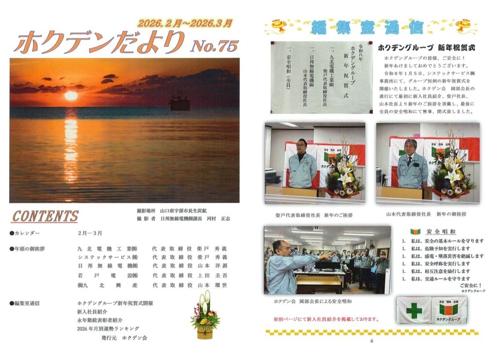 コンテンツ CONTENTS ホーム コンテンツ No.75 ホクデンだより 2026.02.20 No.75 ホクデンだより スタッフブログ 今年最初の「ホクデンだより」が完成しました♪ 毎年、仕事始めに『新年祝賀式』を執り行っております。 この日は、なかなか会うことのないグループ会社の社員も集まります。 新入社員の紹介なども行っており、初めての外国人社員の入社にとても賑わいました♬ その他、永年勤続表彰者の紹介も掲載しています。 今回は、13名の社員が表彰されました!! これからも、長く勤め続けたいと思ってもらえる会社づくりに励んでまいります。 一覧へ戻る